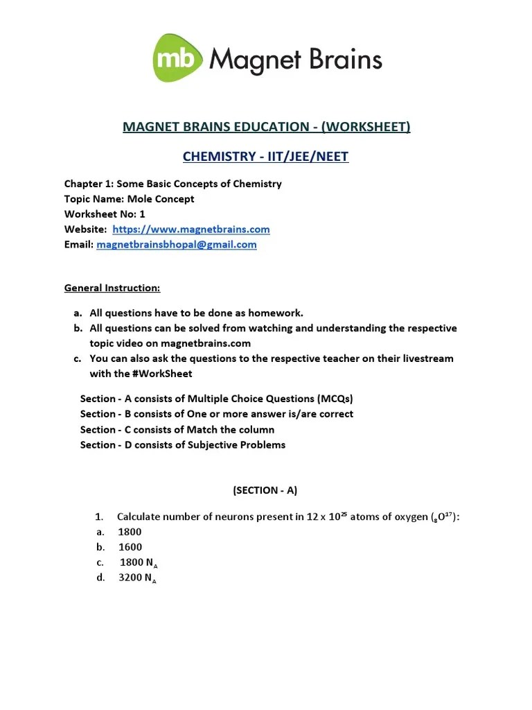 Chemistry Worksheet Mole Concept Answers : 2 :. One 12c atom weighs 12 amu's (exactly),. The answer is the unit called the mole. How many grams are there in 11.8 moles of sodium . First, from the definition of a mole: The molecules need to be quickly counted!